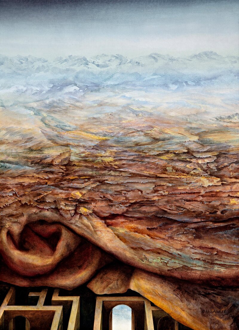 „Überlagerung“ ist eines der typischen Werke Claus Dietrich Hentschels: Realistische Ansichten vermischen sich mit abstrakten, surrealistischen Elementen.