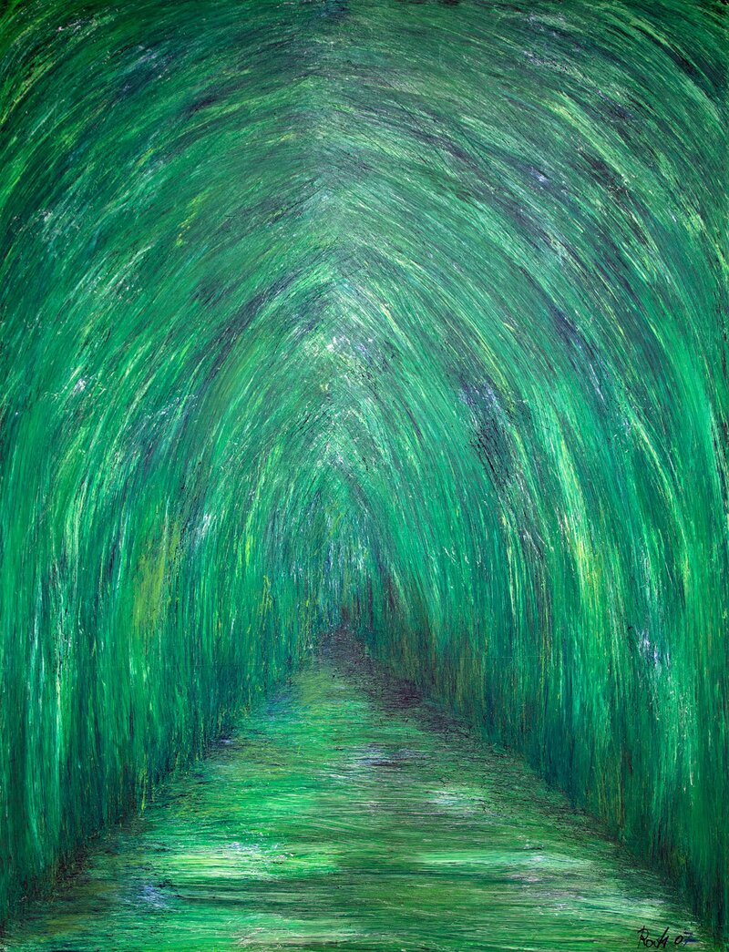 In seinem Gemälde kombiniert Fernand Roda (*1951 in Luxemburg) das aufstrebende Kirchenschiff einer gotischen Kathedrale mit einem Wald und stellt so einen Bezug zwischen Architektur und Natur her. Dabei kombiniert er in der für ihn typischen expressiven Geste Landschaft, Formen und explodierende Farben, das üppige Wuchern der Natur mit der Strenge geometrischer Flächen. Dieses Werk hat auch eine weitere Dimension, nämlich den Bezug zur geistigen Welt: Innerer Frieden kann sowohl in einer Kathedrale als auch in der Natur gefunden werden.