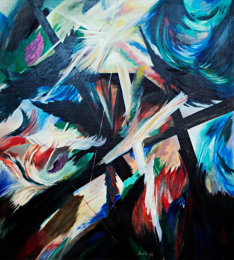 "Er" ist Jesus Christus, der Messias, der nach christlichem Glauben dort gemeinsam mit zwei anderen Verurteilten gekreuzigt wurde. Die römischen Besatzer Judäas hatten für ihn die grausamste Hinrichtungsmethode ihrer Zeit vorgesehen. Denn der Mann, der als Gottes Sohn betrachtet wurde, das kommende Reich Gottes ankündigte und sich als König der Juden bezeichnete, forderte die politische und religiöse Macht der römischen - wörtlich - "vergöttlichten" Kaiser heraus. Gerade in ländlichen Provinzen fand das Christentum Zulauf und wurde zum wachsenden Problem für die römischen Behörden, die mit brutaler Härte darauf reagierten. Die Kreuzigung Jesu in der Hinrichtungsstätte Golgatha, damals noch außerhalb der Stadt Jerusalem gelegen, hat zahllose Künstlerinnen und Künstler inspiriert. Sie gehört zu den zentralen Mythen des christlichen Glaubens. Martin Rabes Gemälde reiht sich somit in eine lange Tradition ein. Erst auf den zweiten Blick erschließen sich den Betrachterinnen und Betrachtern die drei Kreuze in seinem Gemälde, das seinem typischen Malstil entspricht: leuchtende Farben, die in manchmal wirbelnden, manchmal zerrissenen Formen hier nur mühsam gebändigt sind.