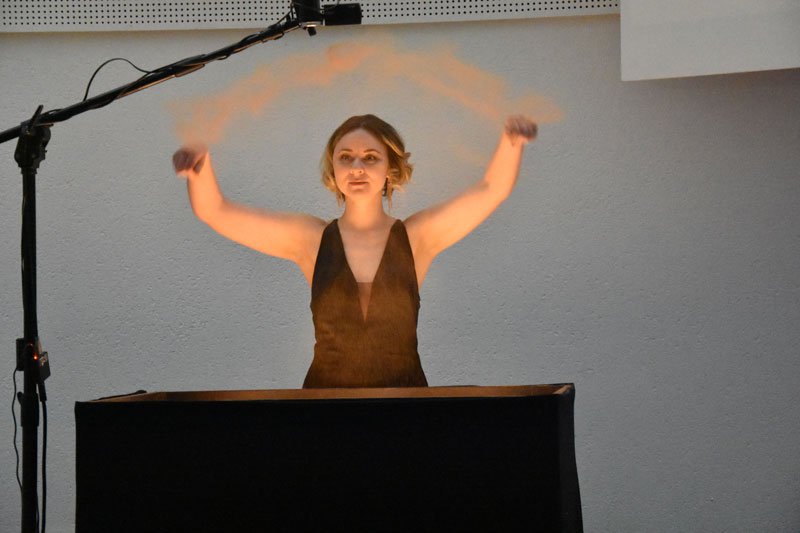 Die dazugehörigen Bilder nahmen ebenso schnell Gestalt an, wie sie wieder vergingen. Titovas Hände waren in ständiger Bewegung, wenn sie Sand mit beeindruckender Präzision auf die Scheibe rieseln ließ und ihm vor dem staunenden Publikum Leben einhauchte. Ihr war anzusehen, wie viel Spaß ihr ihre Kunst trotz der zweifellos anstrengenden Tournee machte – hochkonzentriert und gleichzeitig versunken lächelnd bezauberte sie die Gäste.