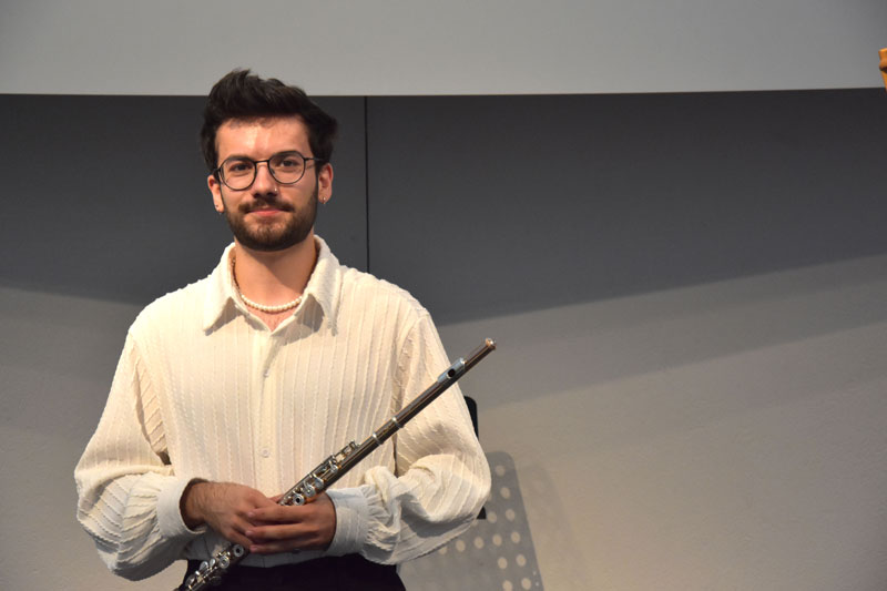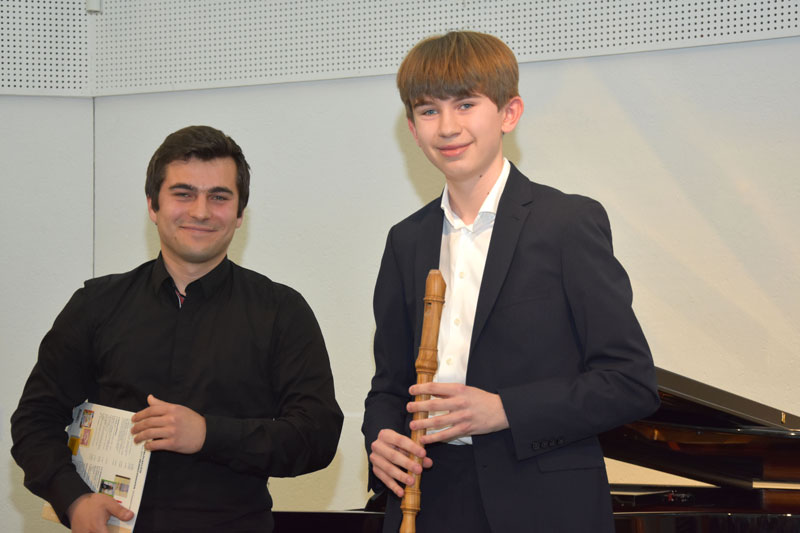 Danach hieß es Bühne frei für zwei Flötisten: Lance Weisen aus Luxemburg überraschte mit dem persönlich interpretierten Stück „The Great Train Race“ (Das große Zug-Rennen) von Ian Clarke. Querflötenspiel, wie man es normalerweise nicht hört: Schnelles Spiel, Mehrklänge, Singen und Spielen sowie Lippenbeugen brachten den „Zug“ zum Rasen, und dazu hatte er sogar eine eigene faszinierende Choreografie eingeübt. Der auf ihn folgende Nicolas Birkenheier schien ebenfalls sein Instrument neu erfunden zu haben: So schnell, geschmeidig und meisterhaft spielte der Saarländer Blockflöte, dass man kaum merkte, wie er atmet. Ebenso atemlos verfolgte auch das Publikum seine Darbietung.